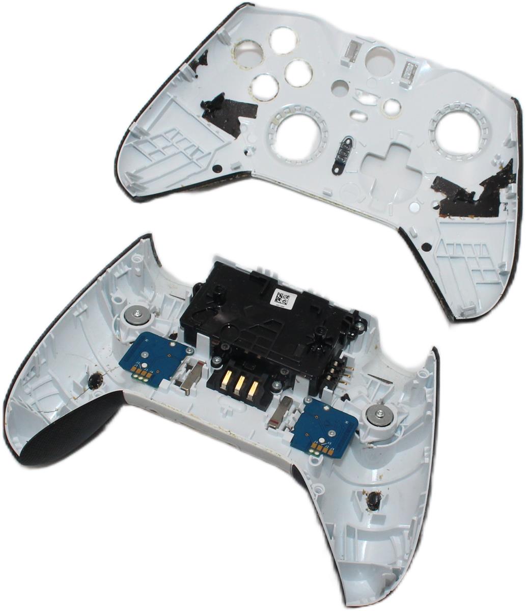 Angeboten wird ein originales Gehäuse für den Microsoft Xbox Elite Series 2 Controller in der Farbe Weiß, inklusive Akku und einigen Anbauteilen.